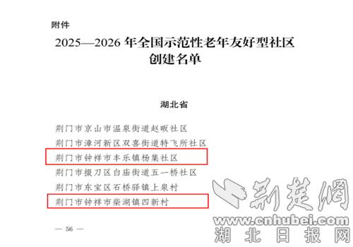 京中网讯(湖北日报网)(通讯员 赵吉 通讯员 孙中岳)近日,国家老龄工作组秘书处发布了2025年至2026年全国老年友好示范社区名单,钟祥镇柴湖镇刘新村、丰乐市杨集村入选,跻身全国评价的2000个村庄之列。