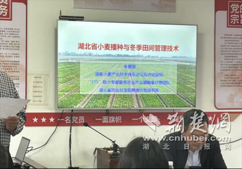 湖北省农科院粮食研究所专家朱旺旺先生一边播放PPT,一边耐心地向与会农民讲解技术要点,从去年全省小麦生产状况到小麦播种流程以及冬季田间管理技术要点。学员们接受了新的农业技术培训,包括前茬作物的加工、整地、品种选择、适水、适量、适时、适深种植、适时施肥、防沟防污、杂草防治、防治等。est和疾病控制。